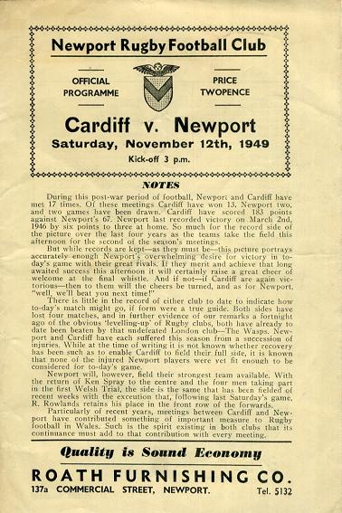 "During this post-war period of football, Newport and Cardiff have met 17 times. Of these meetings Cardiff have won 13, Newport two, and two games have been drawn. Cardiff have scored 183 points against Newport's 67. Newport last recorded victory on March 2nd, 1946 by six points to three at home. So much for the record side of the picture over the last four years as the teams take the field this afternoon for the second of the season's meetings."