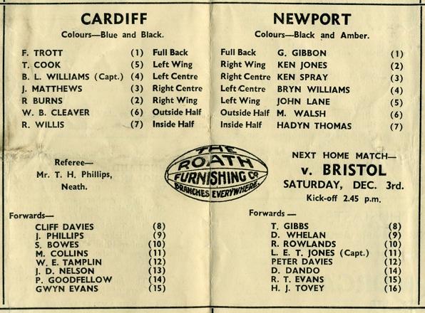 "There is little in the record of either club to date to indicate how to-day's match might go, if form were a true guide. Both sides have lost four matches, and in further evidence of our remarks a fortnight ago of the obvious 'levelling-up' of Rugby clubs, both have already to date been beaten by that undefeated London club - The Wasps. Newport and Cardiff have each suffered this season from a succession of injuries. While at the time of writing it is not known whether recovery has been such as to enable Cardiff to field their full side, it is known that none of the injured Newport players were yet fit enough to be considered for to-day's game."