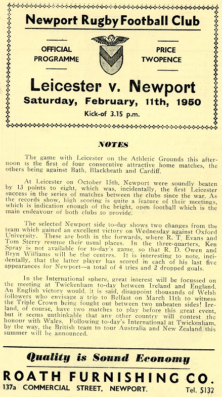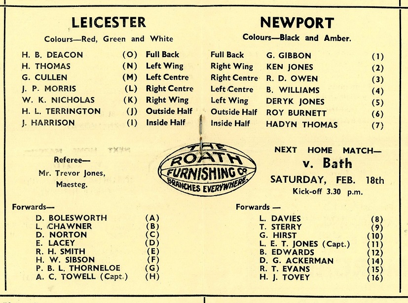 "At Leicester on October 15th, Newport were soundly beaten by 13 points to eight, which was, incidentally, the first Leicester success in the series of matches between the clubs since the war. As the records show, high scoring is quite a feature of their meetings, which is indication enough of the bright, open football which is the main endeavour of both clubs to provide."