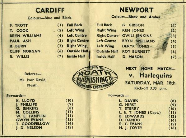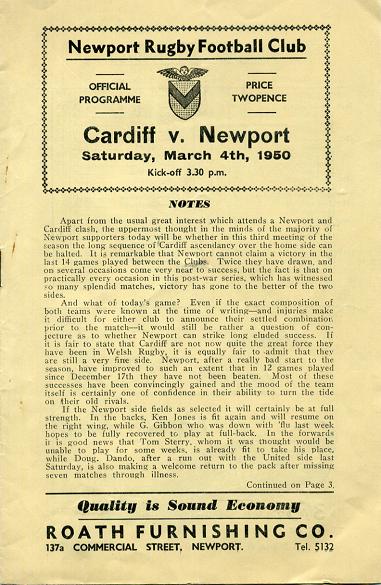 "Apart from the usual great interest which attends a Newport and Cardiff clash, the uppermost thought in the minds of the majority of Newport supporters today will be whether in this third meeting of the season the long sequence of Cardiff ascendancy over the home side can be halted. It is remarkable that Newport cannot claim a victory in the last 14 games played between the Clubs. Twice they have drawn, and on several occasions come very near to success, but the fact is that on practically every occasion in this post-war series, which has witnessed so many splendid matches, victory has gone to the better of the two sides."