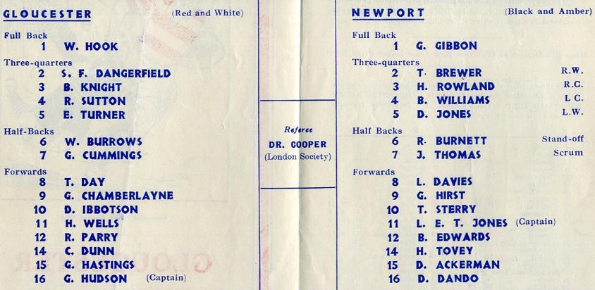 "The two previous matches at Kingsholm have resulted in wins for Gloucester by 6 - 3 (48/9), and 7 - 3 (47/8). In 1946/7 the match was transferred to Newport owing to flooding at Kingsholm."