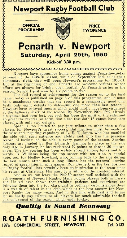 "Newport have successive home games against Penarth - to-day to wind up the 1949-50 season, while on September 2nd, as is their customary right, they will open Newport’s programme for 1950-51. But at the beginning or end. Penarth are welcome visitors whose efforts are always for bright, open football. At Penarth earlier in the season, Newport just won by six points to five."
