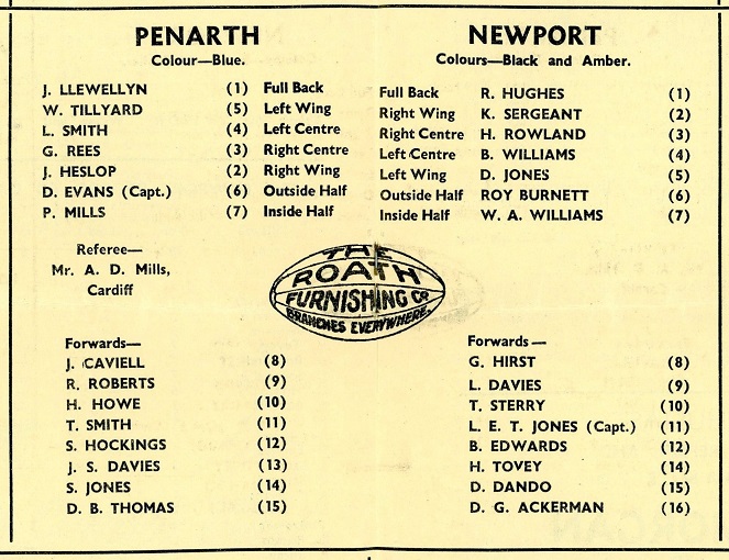 "Space is too limited to pay just tribute to other than a few players for Newport’s great success. But mention must be made of the wise and inspiring captaincy of L. E. T. Jones, who has moulded the side with such patience and ability and who has the personal record of having led the side in every game of the season. Scoring honours are headed by Ben Edwards. Gaining his place in the side only late in January, he has registered 79 points to date in 20 appearances. The try scoring has been widely spread among backs and forwards. B. Williams being the top scorer with ten tries. A special note, too, for Hedley Rowland, who, coming back to the side during the last month after such a long illness, has the personal scoring record of seven tries in nine games. Roy Burnett, in the key position in Rugby football, has certainly been an inspiration to the team since his return at Christmas. His must be a future of the greatest interest."