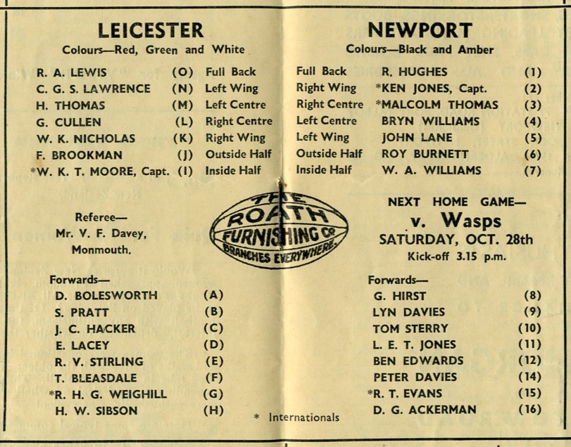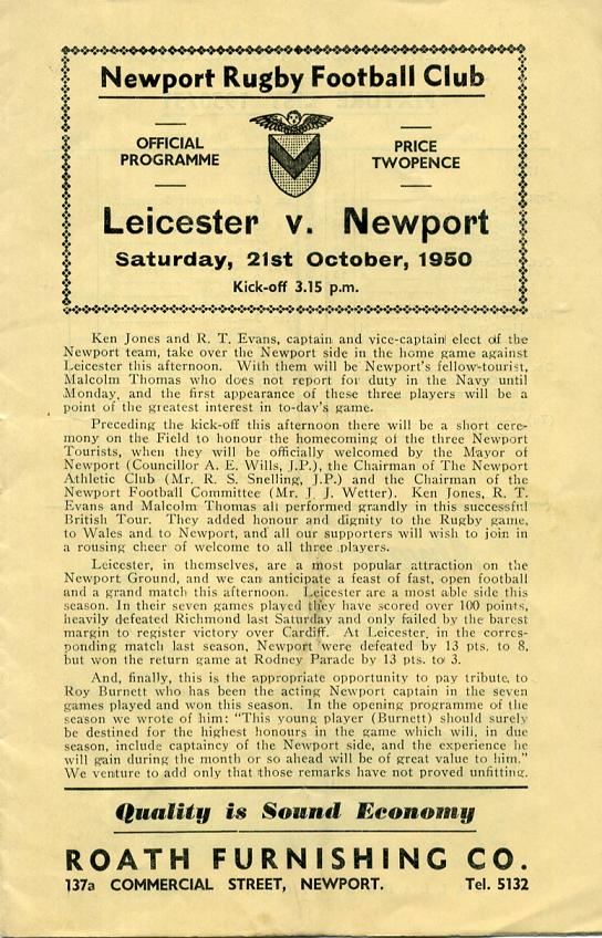 "Preceding the kick-off this afternoon there will be a short ceremony on the Field to honour the homecoming of the three Newport Tourists, when they will be officially welcomed by the Mayor of Newport (Councillor A. E. Wills, J.P.), the Chairman of The Newport Athletic Club (Mr. R. S. Snelling, J.P.) and the Chairman of the Newport Football Committee (Mr. T. J. Wetter). Ken Jones, R. T. Evans and Malcolm Thomas all performed grandly in this successful British Tour. They added honour and dignity to the Rugby game, to Wales and to Newport, and all our supporters will wish to join in a rousing cheer of welcome to all three players."