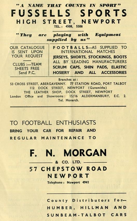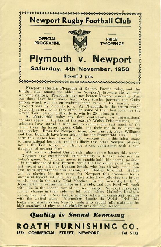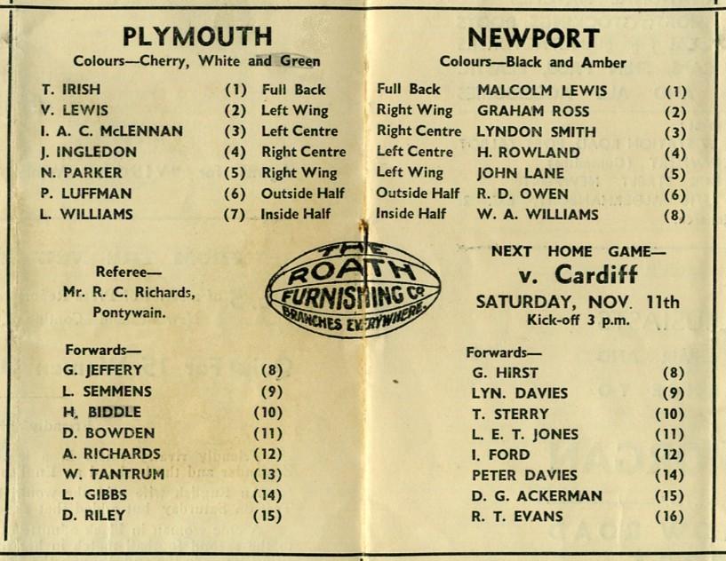 "With such a talented United side - also not yet beaten this season - Newport have experienced little difficulty with team selection for today's game. R. D. Owen moves to outside half - his normal position - in the absence of Roy Burnett, while the two centre positions thus left vacant are filled by Lyndon Smith, who has already made four first team appearances this season, and Hedley Rowland. Hedley will be playing his first game for Newport this season - after, a successful try-out with the United last Saturday - following the injury to his hand in the early Trial Matches. In the forwards, L. E. T. Tones is fit to resume his place in the side, and Ian Ford will pack with him in the second row of the scrummage. Newport make one further change ini their side - at full back, where Malcolm Lewis, a strong player with a long kick, is selected following consistent promise with the United team. Altogether - despite the Welsh Trial - this looks a most interesting Newport side who should fully maintain the high standard of play so delightfully provided this season."