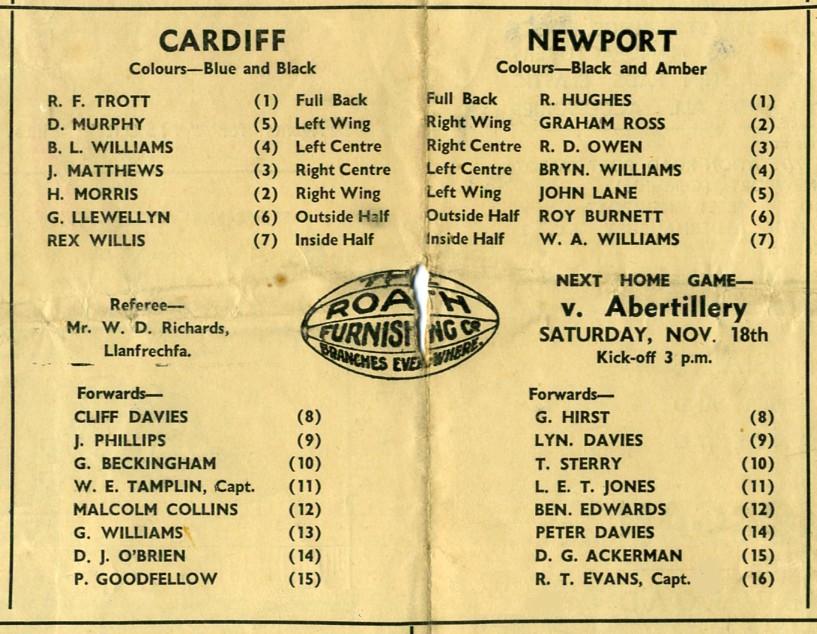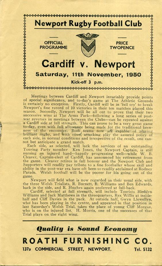 "Meetings between Cardiff and Newport invariably provide points of special significance, and to-day's game at The Athletic Grounds is certainly no exception. Firstly, Cardiff will be in 'full cry' to break Newport's fine record of 10 victories in their ten matches played this season. Secondly, Newport will be all out to prove that their two successive wins at The Arms Park - following a long series of postwar reverses in meetings between the Clubs - can be repeated against a Cardiff side at full strength. This can prove to be a very great game to-day, even with full allowance being made for the traditional keenness of the encounter. Both teams now are capable of playing brilliant rugby, and with open, attacking play the assured policy of each side, in normal conditions and irrespective of the result, one cannot but anticipate a grand match."