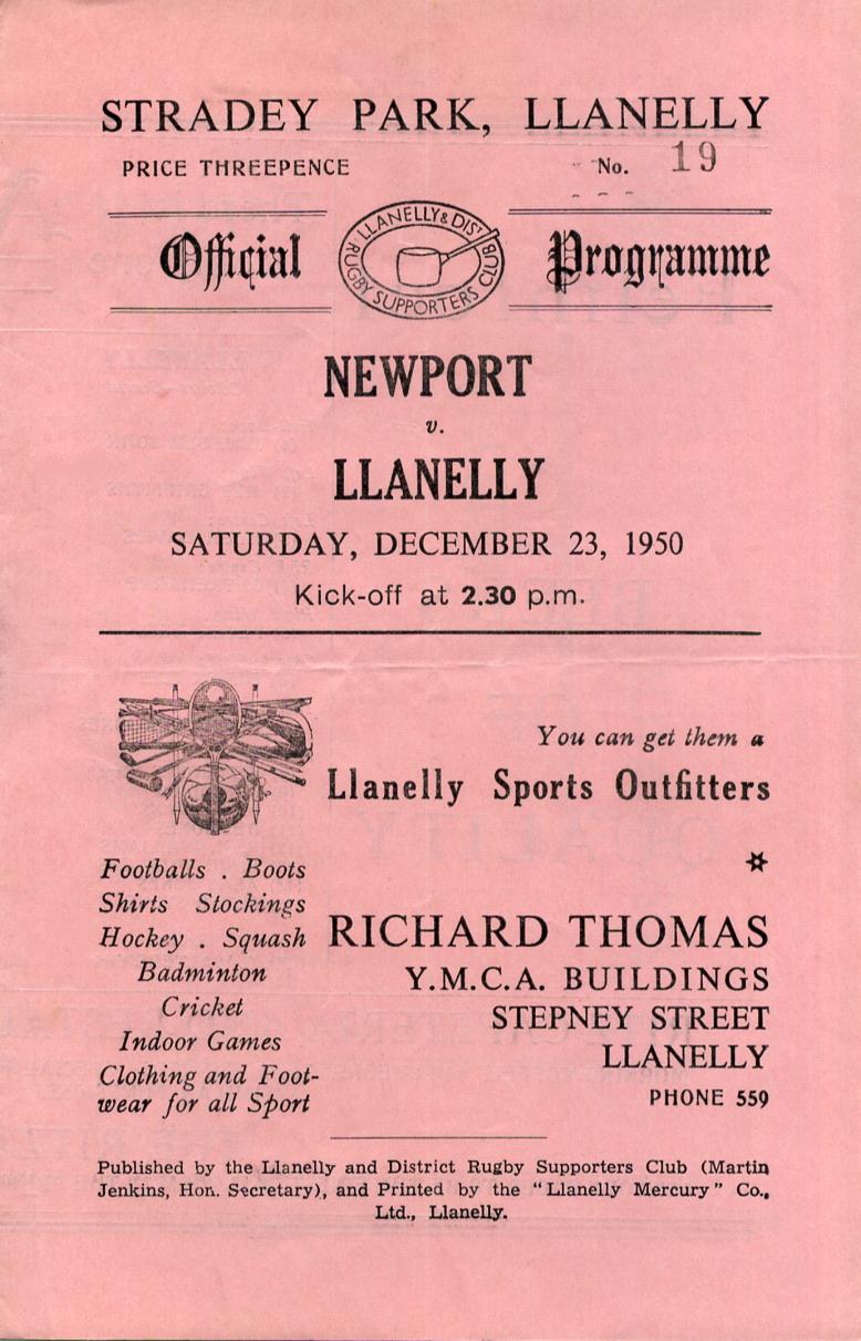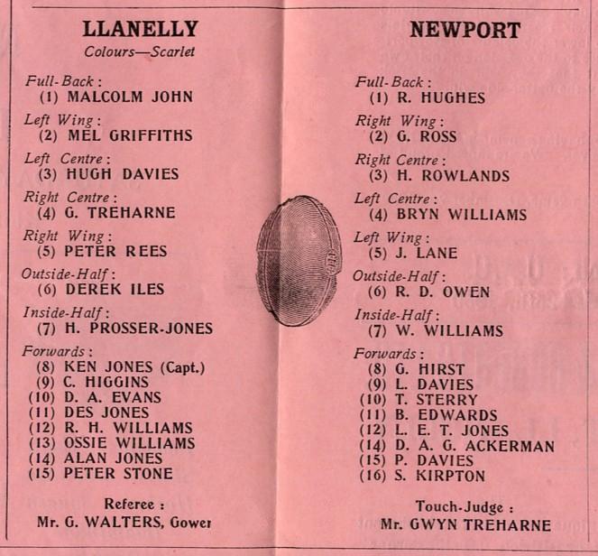 "There could be no better start to the holiday games than the visit of Newport to the Stradey to-day. So far they are unbeaten, having won all their matches - 15 altogether, a wonderful record. It is unfortunate that the second Welsh Trial match is being held to-day with the result that both sides will be weakened by the absence of their stars. Newport have two players in the Trial and their Skipper and Welsh International, Ken Jones is in Ireland playing with Carl Mullen's XV. Llanelly have five players in the Trial. This is bound to take a little interest from the game, but one thing we are certain of, that to-day's game will be a titanic struggle. Newport all out to preserve their record and the Scarlets equally determined to be the first team to lower the colours of Newport. The Scarlets are proud of their ability to rise to the occasion on their own ground and home supporters are confident that they will do the trick to-day. Good luck to both teams and may the better side win."