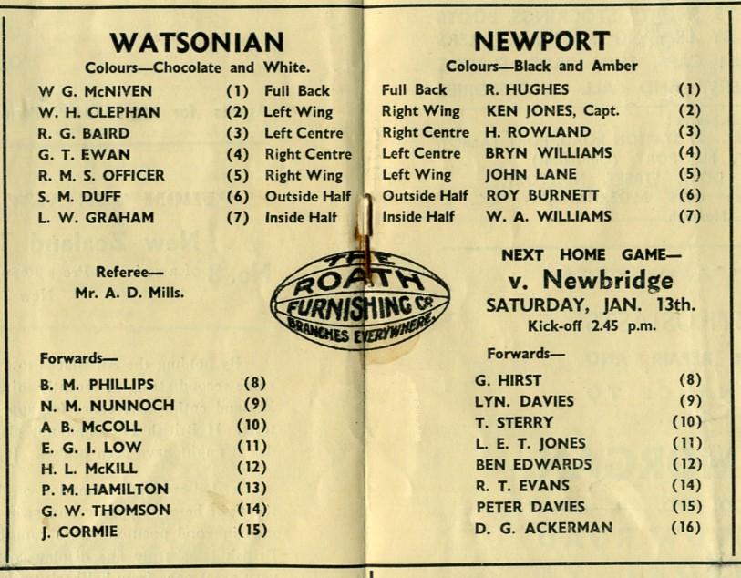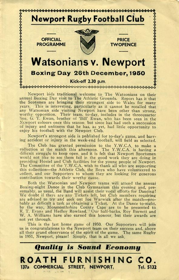 "Newport bids traditional welcome to The Watsonians on their annual Boxing Day visit to The Athletic Grounds. Report has it that the Scotsmen are bringing their strongest side to Wales for many years. This is interesting, particularly as it cannot be recalled that any Watsonian side visiting Newport have been other than strong, worthy opposition. Their team, to-day, includes in the threequarter line, G. T. Ewan, brother of 'Bill' Ewan, who has been seen in the Newport colours once this season, but since has had such a succession of injury and unfitness that he has, as yet, had little opportunity to enjoy his football with the Newport Club."