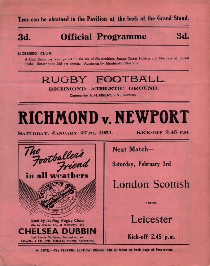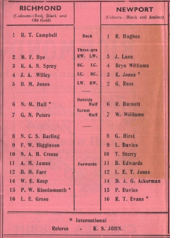 "In beating Richmond in the presence of a record crowd for the Richmond ground by three goals and three tries (24 points) to a dropped goal and a penalty goal (six points), the Newport team added another page to the glorious history of the club. This success was the twenty-first in as many matches this winter and, as the last nine fixtures of last season ended in victories, Newport have now won 30 games in succession – a record for the club, beating even the performances of the "Invincibles" of the 1890's and the early 1920's."