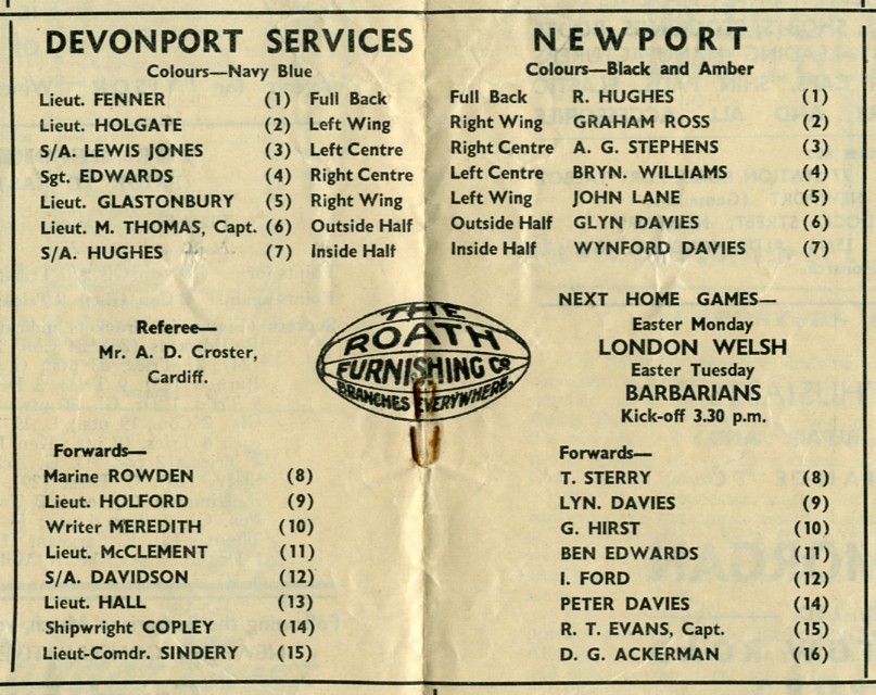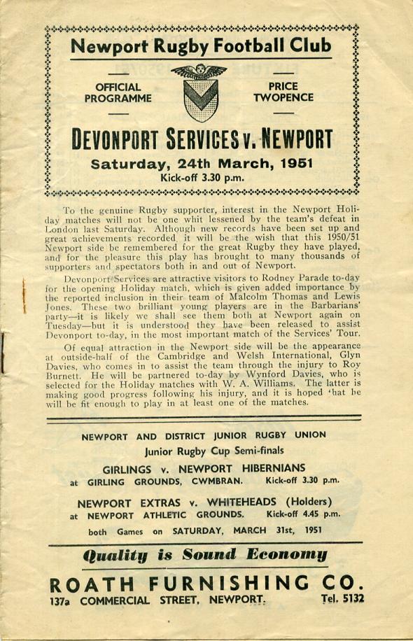 "Devonport Services are attractive visitors to Rodney Parade to-day for the opening Holiday match, which is given added importance by the reported inclusion in their team of Malcolm Thomas and Lewis Jones. These two brilliant young players are in the Barbarians' party - it is likely we shall see them both at Newport again on Tuesday - but it is understood they have been released to assist Devonport to-day, in the most important match of the Services' Tour."