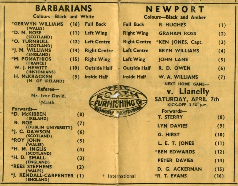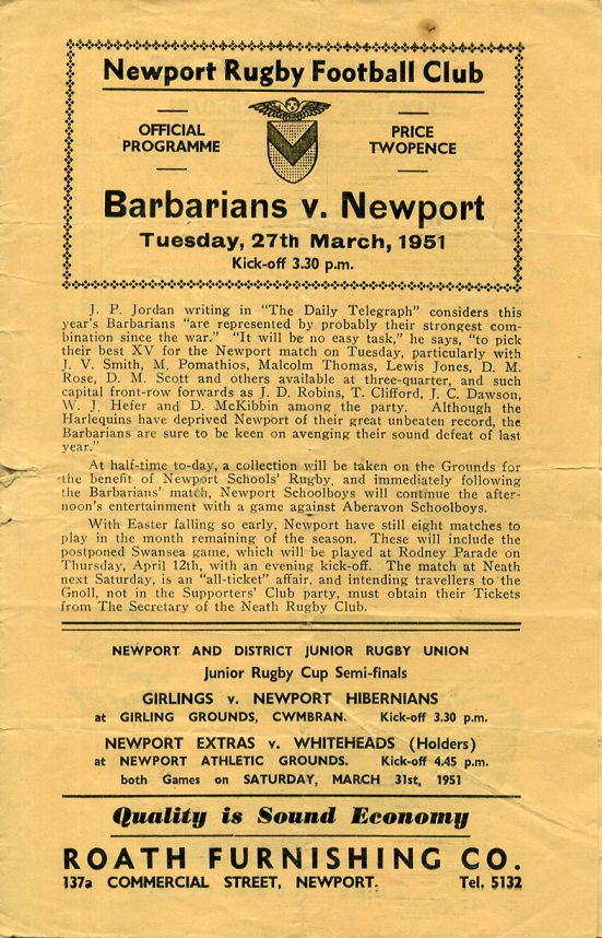 "At half-time to-day, a collection will be taken on the Grounds for the benefit of Newport Schools' Rugby, and immediately following the Barbarians' match, Newport Schoolboys will continue the afternoon's entertainment with a game against Aberavon Schoolboys."