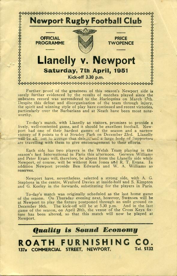 "To-day's match, with Llanelly as visitors, promises to provide a lively, well-contested game, and it should be excellent football. Newport had one of their hardest games of the season and a narrow victory of 8 points to 6 at Stradey Park on December 23rd. Llanelly will be all out to avenge that defeat, and a large body of Supporters are travelling with them to give encouragement to their efforts."
