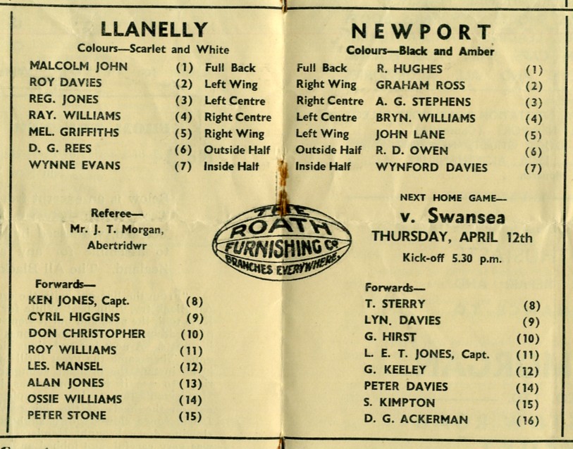 "Each side has two players in the Welsh Team playing in the season's last International in Paris this afternoon. Gerwyn William and Peter Evans will, therefore, be absent from the Llanelly side while Newport, of course, will be without Ken Jones and R. T. Evans. In addition Newport provide Ben Edwards and W. A. Williams as reserves."