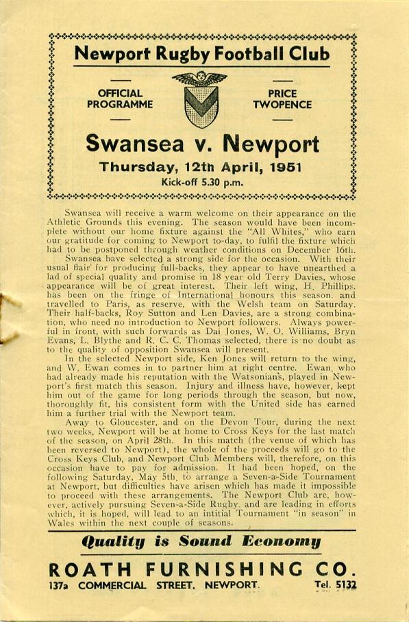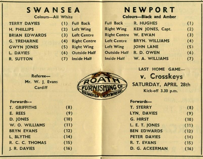 "Swansea have selected a strong side for the occasion. With their usual flair for producing full-backs, they appear to have unearthed a lad of special quality and promise in 18 year old Terry Davies, whose appearance will be of great interest. Their left wing, H. Phillips, has been on the fringe of International honours this season, and travelled to Paris, as reserve, with the Welsh team on Saturday. Their half-backs, Roy Sutton and Len Davies, are a strong combination, who need no introduction to Newport followers. Always powerful in front, with such forwards as Dai Jones, W. O. Williams, Bryn Evans, L. Blythe and R. C. C. Thomas selected, there is no doubt as to the quality of opposition Swansea will present."