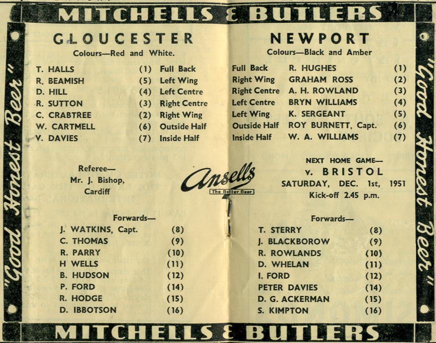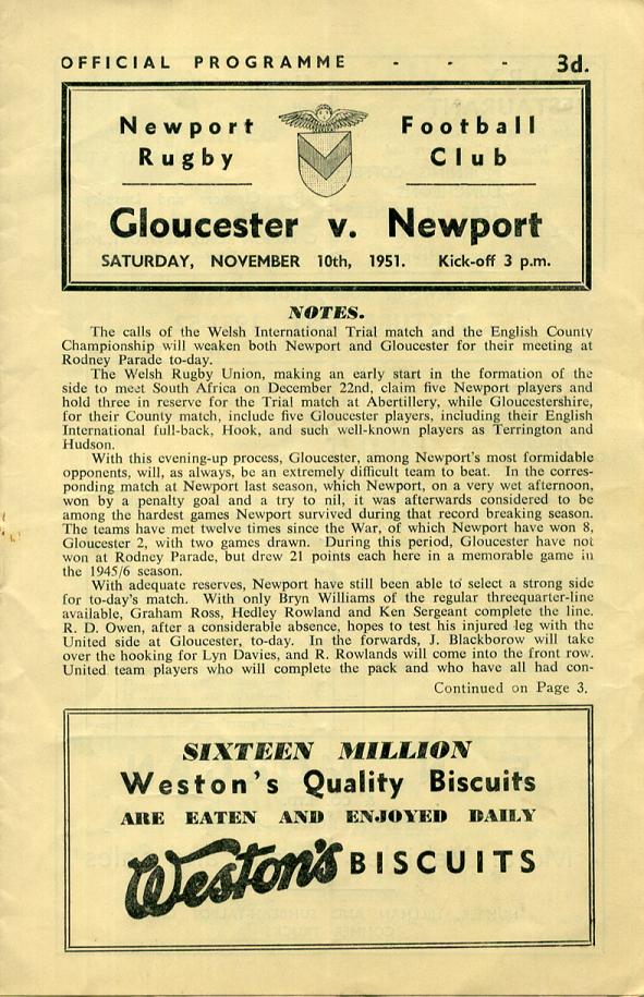 "With this evening-up process, Gloucester, among Newport's most formidable opponents, will, as always, be an extremely difficult team to beat. In the corresponding match at Newport last season, which Newport, on a very wet afternoon, won by a penalty goal and a try to nil, it was afterwards considered to be among the hardest games Newport survived during that record breaking season. The teams have met twelve times since the War, of which Newport have won 8, Gloucester 2, with two games drawn. During this period, Gloucester have not won at Rodney Parade, but drew 21 points each here in a memorable game in the 1945/6 season."