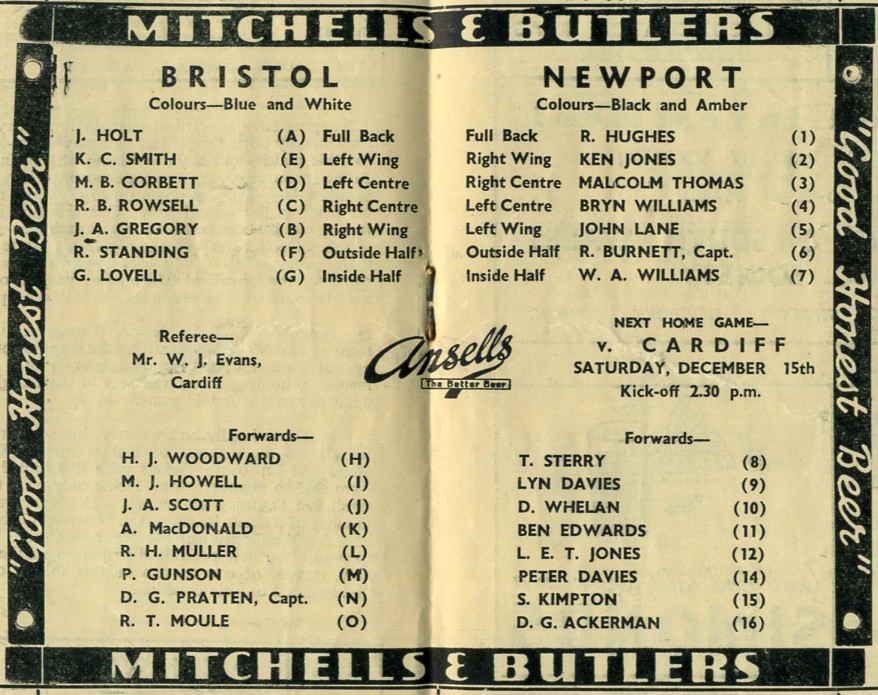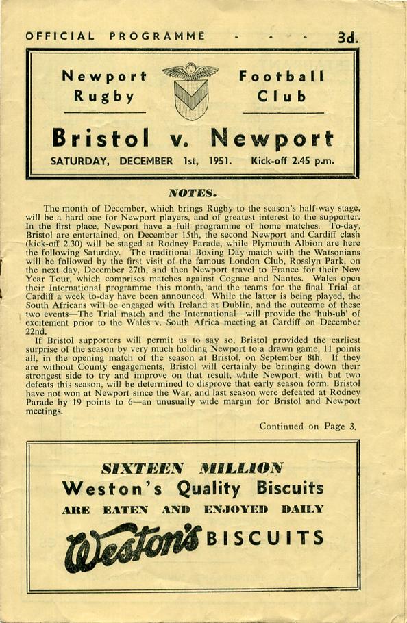 "The month of December, which brings Rugby to the season's half-way stage, will be a hard one for Newport players, and of greatest interest to the supporter. In the first place, Newport have a full programme of home matches. To-day, Bristol are entertained, on December 15th, the second Newport and Cardiff clash (kick-off 2.30) will be staged at Rodney Parade, while Plymouth Albion are here the following Saturday. The traditional Boxing Day match with the Watsonians will be followed by the first visit of the famous London Club, Rosslyn Park, on the next day, December 27th, and then Newport travel to France for their New Year Tour, which comprises matches against Cognac and Nantes. Wales open their International programme this month, and the teams for the final Trial at Cardiff a week to-day have been announced. While the latter is being played, the South Africans will be engaged with Ireland at Dublin, and the outcome of these two events - The Trial match and the International - will provide the 'hub-ub' of excitement prior to the Wales v. South Africa meeting at Cardiff on December 22nd."