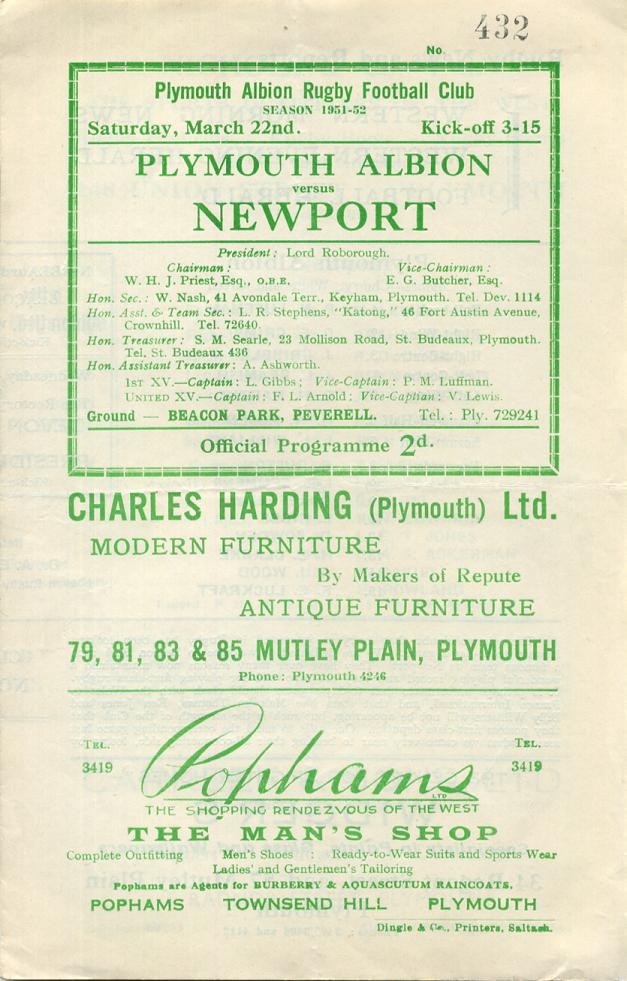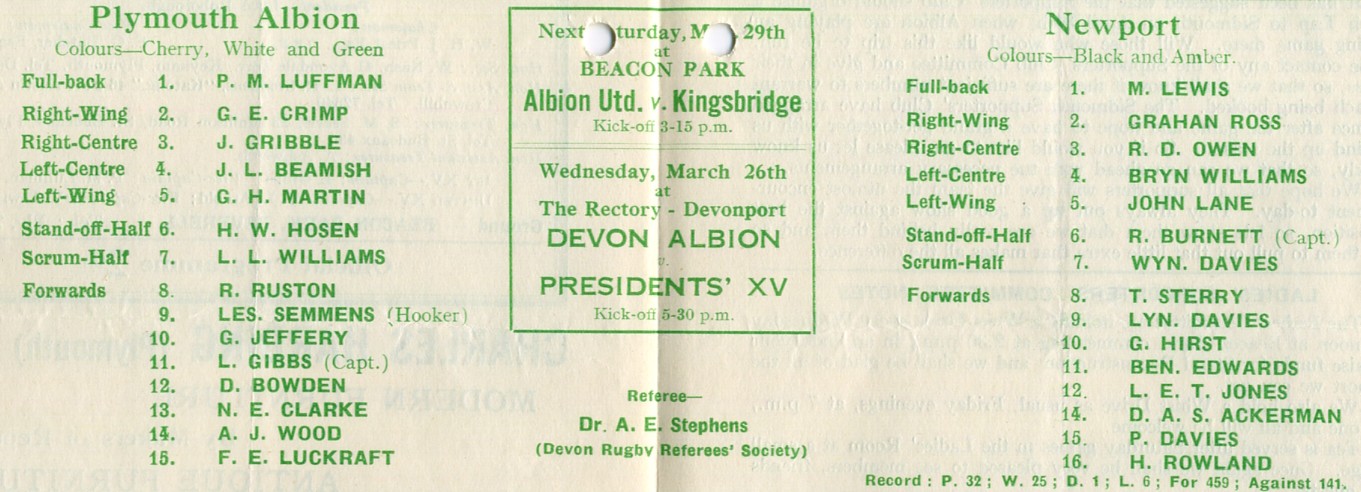 "There is no doubt that everyone interested in Rugby has been looking forward to to-day's game. We are delighted to welcome to Beacon Park such a famous team as Newport. They have over many seasons now maintained a wonderful playing record and they are renowned for playing first-class rugby. It is perhaps unfortunate that to-day's game should clash with the Wales v. France International, and that stars like Malcolm Thomas, Ken Jones and Billy Williams will not be appearing, but such is the strength of the Club that they possess first-class deputies. One calls to mind, the corresponding game last season when we came very near to beating their all-conquering side, losing by only 0 points to 5 points. That day Albion played the "game of their life." We hope to-day for a similar close encounter."