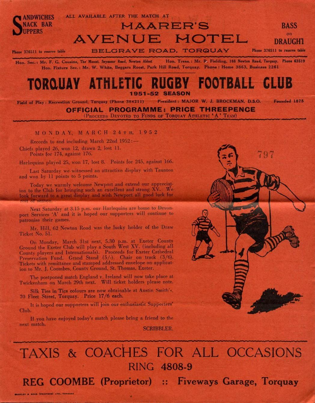 ''Next Saturday at 3.15 p.m. our Harlequins are home to Devonport Services 'A' and it is hoped our supporters will continue to patronise their games."