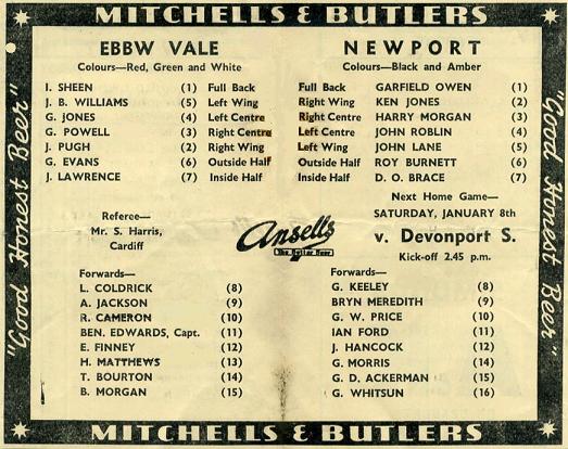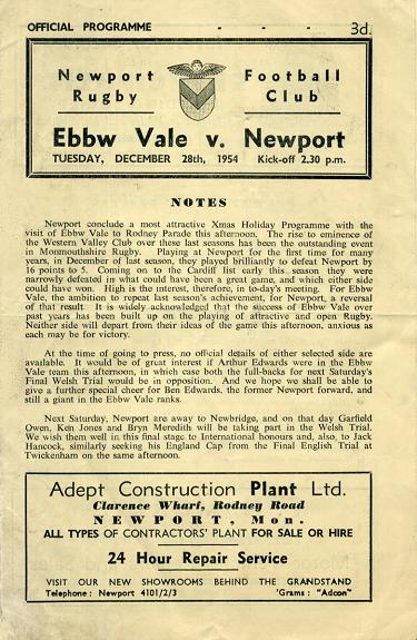 "Newport conclude a most attractive Xmas Holiday Programme with the visit of Ebbw Vale to Rodney Parade this afternoon. The rise to eminence of the Western Valley Club over these last seasons, has been the outstanding event in Monmouthshire Rugby. Playing at Newport for the first time for many years, in December of last season, they played brilliantly to defeat Newport by 16 points to 5. Coming on to the Cardiff list early this season they were narrowly defeated in what could have been a great game, and which either side could have won. High is the interest, therefore, in to-day's meeting. For Ebbw Vale, the ambition to repeat last season's achievement, for Newport, a reversal of that result. It is widely acknowledged that the success of Ebbw Vale over past years has been built up on the playing of attractive and open Rugby. Neither side will depart from their ideas of the game this afternoon, anxious as each may be for victory."