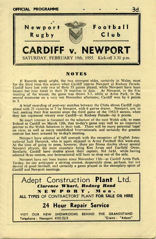 "A brief recording of post-war matches between the Clubs shows Cardiff right ahead with 25 victories to 7 by Newport, with 6 games drawn. Newport, are, in fact, seeking their first success since the third game of the 1952/3 season, when they last registered victory over Cardiff - at Rodney Parade - by 6 points."