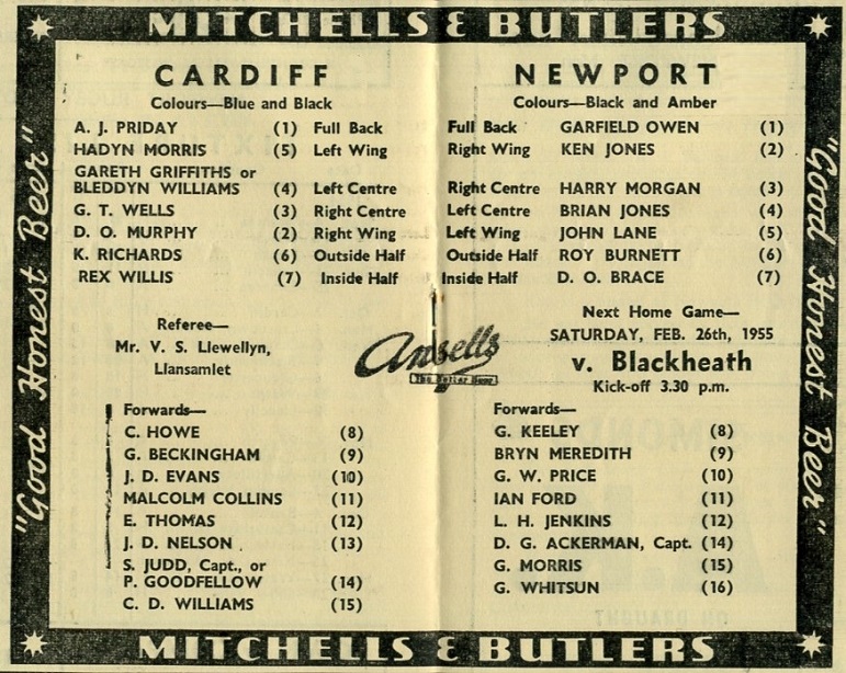 "Newport have selected at full strength with the exception of English International Jack Hancock, who is again engaged in Army Football this week-end. At the time of going to press, however, there are fitness doubts about several Newport players, the most uncertain being Ken Jones and Garfield Owen. Similarly. Cardiff have doubts about their captain, Sid Judd, while having selected three centres, one International will have to drop out of the side."