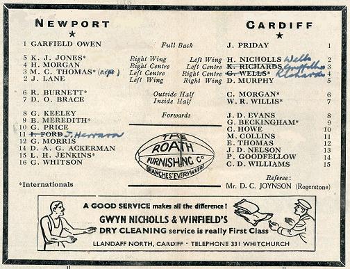 "Despite the calls of the International match, Cardiff will field a strong side, and the fact that young Garfield Owen is on a fitness "trial" for his first cap is an added attraction in the Newport side. We are glad to welcome back Malcolm Thomas as the Newport captain following his long absence through injury!"