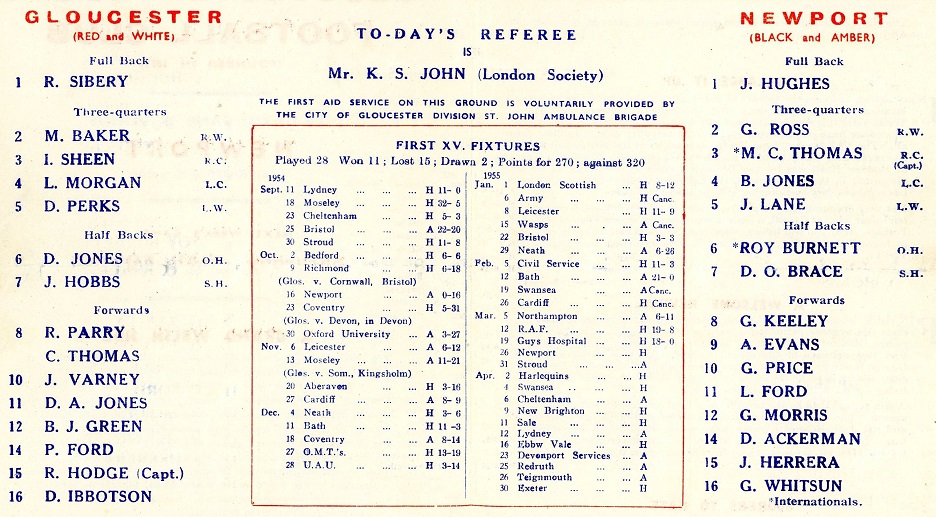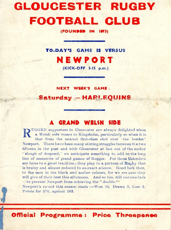 "RUGGER supporters in Gloucester are always delighted when a Welsh side comes to Kingsholm, particularly so when it is that from the nearest first-class club over "the border" Newport. There have been many stirring struggles between the two fifteens in the past and with Gloucester at last out of the earlier "slough of despond," we anticipate something to add to the long line of memories of grand games of Rugger. For these Usksiders are heirs to a great tradition; they play to a pattern of Rugby that is brainy and almost reduced to an exact science. Good luck then, to the men in the black and amber colours, for we are sure they will give of their best this afternoon. And so too, will our own lads - to prevent Newport from achieving the "double." "