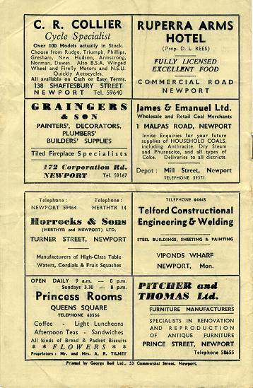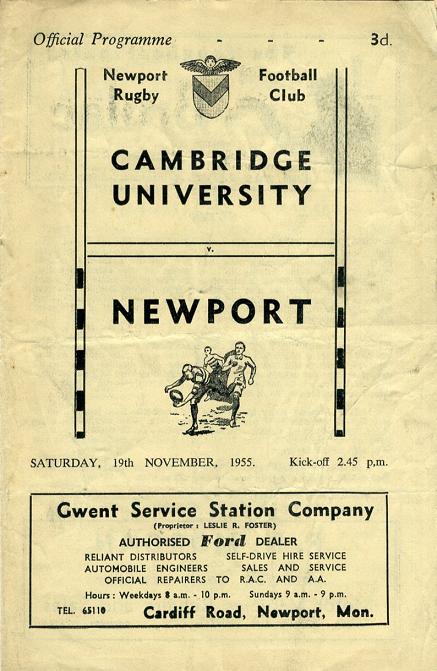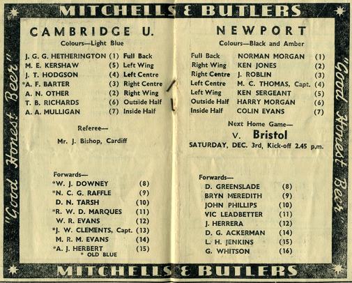 "Last season, on this ground, Cambridge forced a draw, 3 points (dropped goal by Roy Burnett) to 1 try, and the season before at Cambridge, Newport lost by 15 points to 11 points. Varsity football has a particular style of its own, copybook passing, and fast intelligent forward play, besides adventurously turning defence into attack, so to-day in all probability they will exploit their traditional approach to the game. A good performance to-day should maks them favourites for the "Battle of the Blues"."