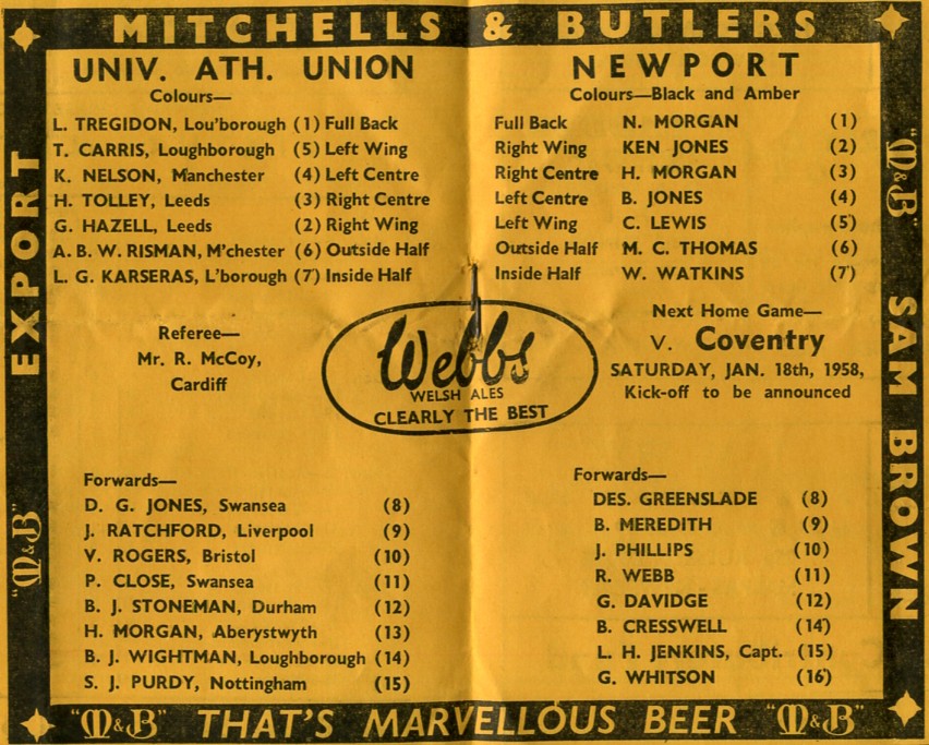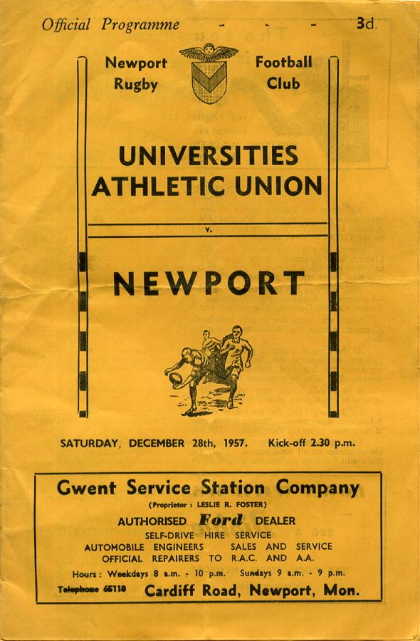 "We close our holiday games to-day against a side making their initial appearance on this ground. We extend a hearty welcome to the Universities Athletic Union XV. We were fortunate to arrange a game with a side so strong as the U.A.U. at short notice."