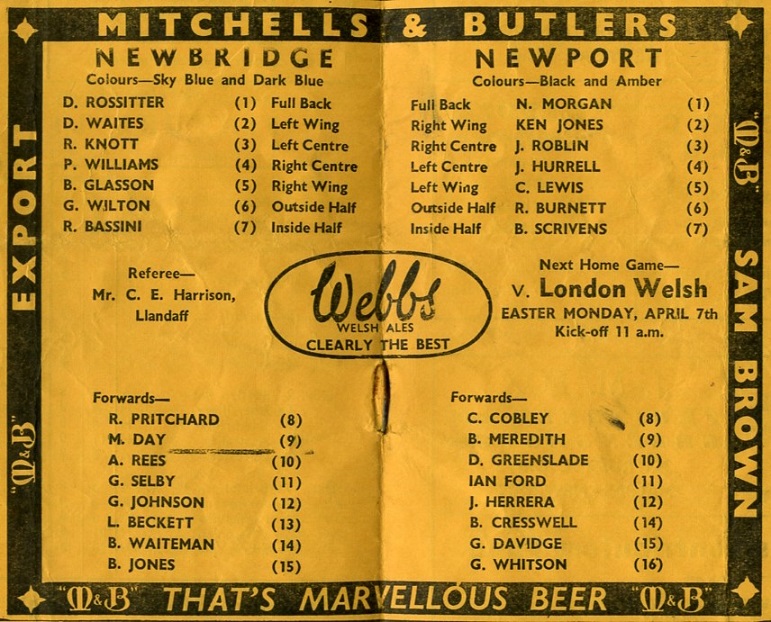 "The Barbarians game on Tuesday is a 4 p.m. kick-off. A curtain-raiser has been arranged. The invincible Newport Schoolboys XV will oppose Swansea Schoolboys. The Newport boys have averaged over 20pts per game. They have also reached the final of the Dewar Shield, and must meet Neath Schoolboys home and away, with the side having the highest aggregate of points holding the shield for one year. A unique honour has also come their way in the selection of two of their players to lead Wales. Roger Lockyer skippered the side against England at Cardiff and Peter Sanders last week-end did likewise against another England XV at Torquay. During the half-time break on Tuesday a collection will be made for the Newport Schools Rugby Union. Please give generously to help run this Town team. Their masters are very proud of them and so are we."