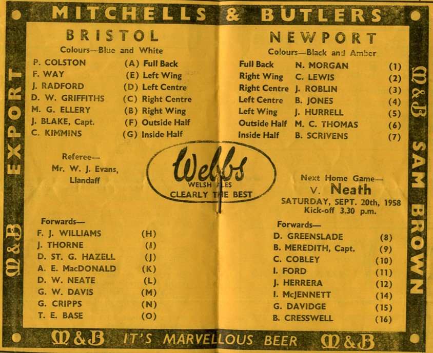 "The only alteration in the Newport team from last Wednesday’s XV is that Brian Cresswell moves around the scrum to take Geoff Whitson position and Ian McJennett takes over the blind-side."
