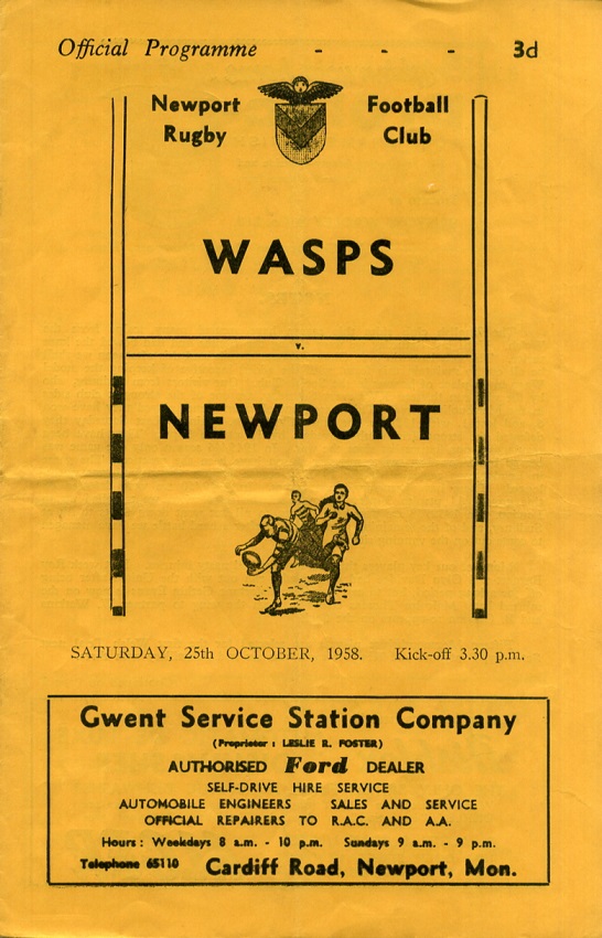 "The English club sides this season have secured many scalps from the Welsh. Until last Saturday we were among the victims and had bowed the knee thrice. The excellent win over Gloucester was a tonic and this afternoon we shall be all out to maintain this form, with the added incentive of keeping the model Wasp in its place of honour in the Social Club. Our visitors from Sudbury, who by the way run thirteen XV’s every Saturday, are one of the strongest club sides in the Metropolitan area. This season out of seven games played they have won 6, and lost 1, with 138 pts. for and only 39 pts. against. Last Saturday they defeated the strong Irish club Belvedere by 13 pts. to 9 pts. They have been regulars on our fixture list since the war. In 1945/46 season only one game was played but since then two games per season have been the practice. The game in London was cancelled during 1951/52 season because the ground was waterlogged. There have been no drawn games. In 1949/50 we were defeated on this ground 11 pts. to 3 pts., but reversed the score when we travelled up to London. In 1952/53 we won here 17 pts. to nil but went down 8 pts to nil at Sudbury, and of the remaining games, always after a hard battle we have managed to come out on the winning side."