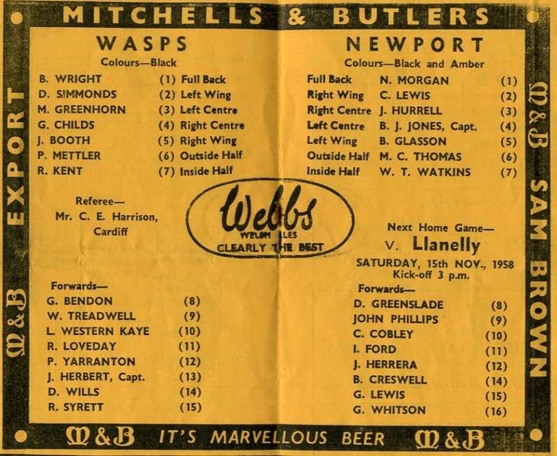 "Supporters were well pleased last Saturday with the excellent display against Gloucester, today we expect the second victory of the season over an English side, although our very welcome visitors "Wasps," usually provide tough opposition, present form however indicates that the "Trophy" will remain for a further spell at the N.A.C."
