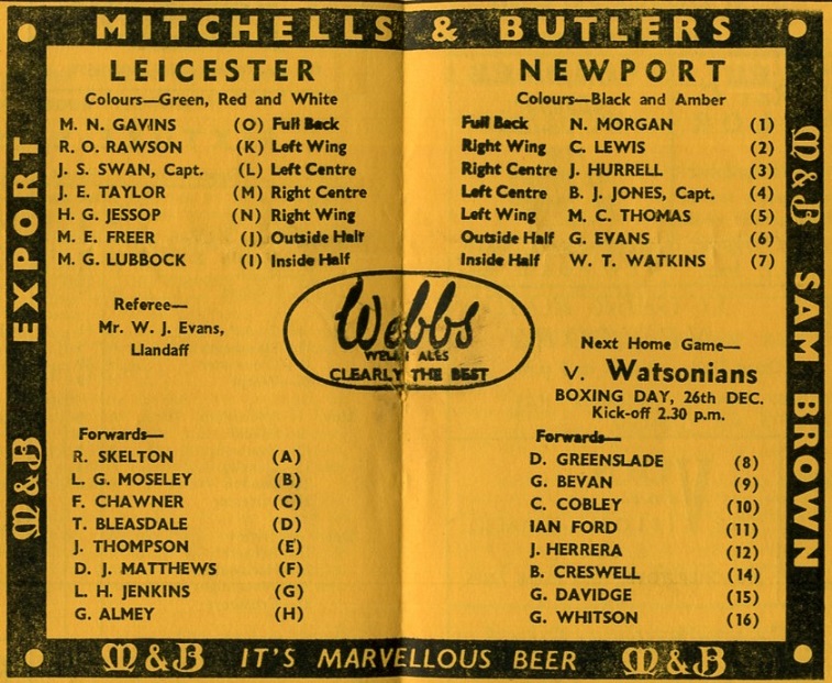 "To-day we play the last home game until Boxing Day. The corresponding game last year was cancelled, but at Leicester we won by 9 pts. to 8 pts. Norman Morgan notched two penalty goals and Malcolm Thomas scored a try, whilst the "Tigers" scored a penalty and a converted goal. Leighton Jenkins our skipper of last season is a regular member of the Leicester pack and is also the County captain. It is unfortunate and disappointing that J. P. Horrocks-Taylor (Cambridge and England) and A. J. F. O’Reilly (Old Belvedere and Ireland) are otherwise engaged to-day. These two fine players and no strangers to this ground. They were both in M.R. Steel-Bodgers' XV that defeated Cambridge University last Wednesday. Our visitors' skipper is J. S. Swan who has already collected seventeen "caps" for Scotland. On Thursday Leicestershire defeated Warwickshire and five Leicester players were included."