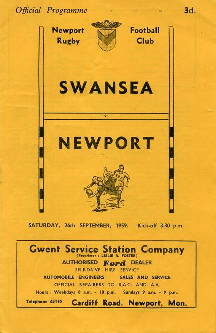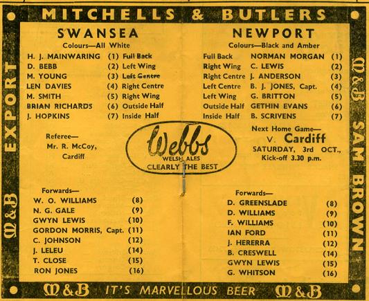 "Swansea are always welcome to Rodney Road, and this season they have more than their usual glamour, because up to and including last Saturday they have emerged victorious from their five games played. Ignoring our inept display last Saturday we are pinning our faith on the form produced at the Memorial Ground, so with Swansea also boasting this famous West Country scalp (also by a large margin), speculation is rife on today's outcome. Swansea had a date with Llanelly on Thursday but unfortunately, at the time of going to print the result was not known. Should the "All Whites" still be unbeaten they will be all out to maintain their success and on the other hand if they have blotted their record they will undoubtedly try to regain any lost prestige, so in any case we face a stiff task. In D. Parkhouse, a diminutive full back they have an adventurous attacking bag of tricks and their threequarters include D. Bebb, the flying Welsh wing and H. J. Mainwaring, who has often played on this ground for the Barbarians. His versatility is well known having played for the Royal Navy and the Baa-Baas at full back, centre threequarter and wing forward, and amongst his accomplishments is the gift of accurate place kicking. Brian Richards at outside half is an evasive runner and has been for some seasons a strong contender for the Welsh team. N. Gale is a hooker with few peers and when Bryn Meredith was ill in the early part of last season he was tipped for his cap. Alongside him is the famous W. O. Williams and trialist Gwyn Lewis. Gordon Morris who skippers the side from the second row is no stranger to us and his displays when wearing the Black and Amber are still fresh in memory. The blond J. Leleu, ex London Welsh and Wales is a devastating wing forward. We show a few changes from last Saturday John Anderson coming in for John Roblin, John Herrera now fit replaces R. Hodson who has returned to college and Geoff. Whitson recovered from his Bristol injury takes over from B. Danahar. Jack Hurrell and Billy Watkins, our two Welsh caps are playing for the United today and it is reasonable to believe that they will challenge again for their 1st team places."