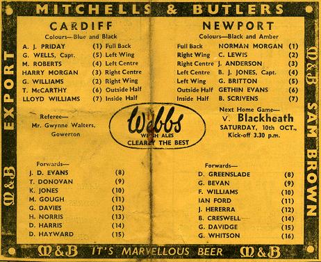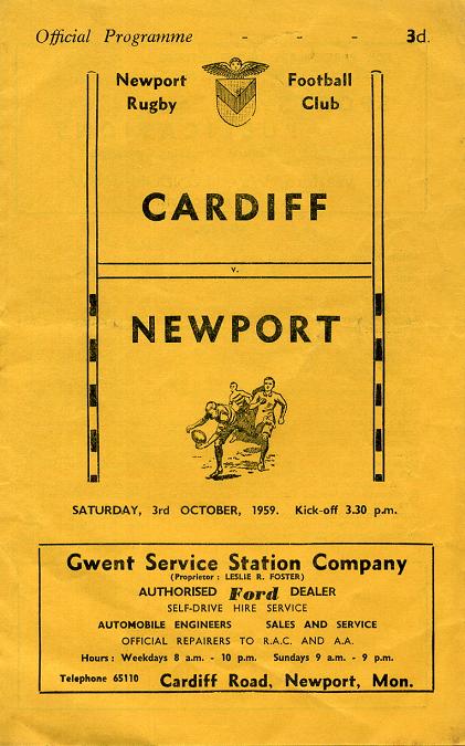 "The usual keen interest in the first of the four meetings is again heightened with both teams taking the field with a big "0" in their "lost" column. It has often been heard that as long as good football is provided the result does not matter, but unfortunately this does not apply in practice, because teams with winning records attract the crowds. Neither team to-day have set their respective rivers on fire but they have succeeded in making to-day's game a topic of rugby conversation this last week. Our visitors from the Capital have scored 136pts. to 52pts. against in 9 games and they intend to make a better start than they did last year against us, and so resurrect the old Blue and Black bogey. On the other hand we shall be out to show that we have forgotten the taste of defeat from our old rivals, in fact since the corresponding game October 5th, 1957, when we lost by 1 try to nil we have staved off any onslaught to lower our colours. Gordon Wells with practically all last year's material has moulded his team into a side tremendously fit and obviously 100% keen. Team building problems have been ironed out and to-day's XV appear to be their strongest available side. International D. Harris is the only newcomer, and he is a tower of strength in the lines-out. Lloyd Williams needs no introduction and with breakaway forward D. Hayward, opportunist G. Wells on the wing and Harry Morgan in the centre they will keep probing for any defects in our armour. We have made one change from last-week, bringing in hooker Graham Bevan for D. Williams. Glyn Davidge is doubtful but Gwyn Lewis can ably deputise. Jack Hurrell requires more match practice so will be playing for the United at Arms Park. Before to-day's game, as a curtain raiser, Newport Schoolboys will be playing Abertillery Schoolboys."