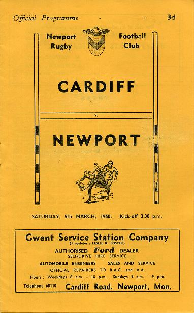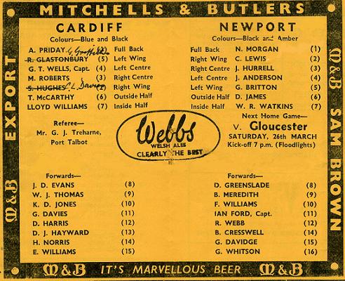"Each new season there is speculation on the outcome of our four encounters with our neighbours from the Welsh Capital. We are still striving to lay claim to four victories in a season and it was hoped that to-day would have had the added poignancy on the settlement of this issue. Cardiff had other ideas and baulked us at the Arms Park a few weeks ago by sharing 12 pts. Nevertheless interest is still very high and with the extra incentive of taking of our ground record and breaking their sequence of failures to win, Gordon Wells and his men will come out hoping to put the record and bogey to rest. The first game was played on this ground and after the usual hard tussle the score was 9 pts. to 3 pts. in our favour. The next meeting was at Cardiff and this will rank among the games that will long be remembered - not for the quality of the play, but for the four penalty goals by Norman Morgan. It is not unusual for the odd long distance goal to be kicked, but each of these were prodigious efforts and our full-back really caused a sensation with his pin-point accuracy, so when the teams trooped off the field we held a leading margin of four points. Allowing only for the games since the Second World War our present run of ten games without defeat is still away behind the achievement of Cardiff who went fifteen games without defeat from 1946/47 season until the last game in 1949/50 which was played at Cardiff."