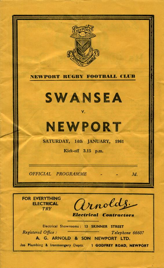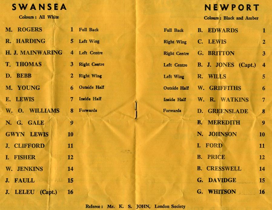"Swansea come to us today with a certain confidence because they inflicted on us our first defeat of the season, at St. Helens, on September 24th. The result 22pts. to 16pts. in itself speaks of a fast exciting game, and rightly so it was described. They field a formidable side and are particularly strong in key positions. M. Rogers is a full-back with a bright future. He has held his place after keen opposition from H. J. Mainwaring and Brian Lewis. Dewi Bebb is one of the current Welsh wings, and H. J. Mainwaring the Barbarian and ex-Navy utility man is partnered at centre by T. Thomas. Marsden Young replaces Brian Richards the Welsh international outside-half. They have a well knit experienced pack with internationals W. O. Williams, N. Gale, J. Faull, J. Leleu plus trialist G. Lewis and J. Clifford."