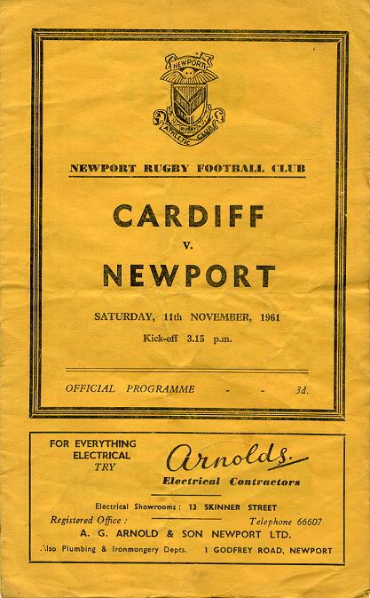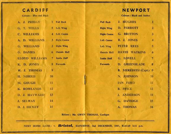 "Our visitors playing record for this season makes good reading, having won 12, lost 2 and drawn 1 with 199pts. for and 73pts. against. Lloyd Williams has proved a canny and inspiring leader, and although he would be the last to admit it, much of the credit is his, because he is a master tactician. A. J. Friday is still a strong candidate for the Welsh team. He seems to reserve his best displays when facing us. The Williams Brothers are making their mark as three-quarters and Gordon Wells has emerged with a youthful zest for adventurous opportunism. Keith Rowlands who was a stalwart of the "Scarlets" for many seasons is now a regular in the power-house section of the pack. Cardiff had five representatives in the 1st Welsh Trial at Tredegar last Saturday, L. Williams, G. Davies, K. Jones, C. H. Norris and W. J. Thomas. In the trial Jones and Norris were "props" to Bryn Meredith and W. J. Thomas was in the opposing front-row, but today Thomas will be between his clubmates and Bryn will be facing them."