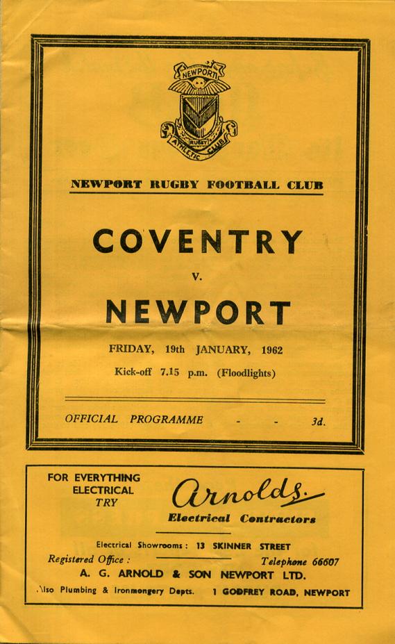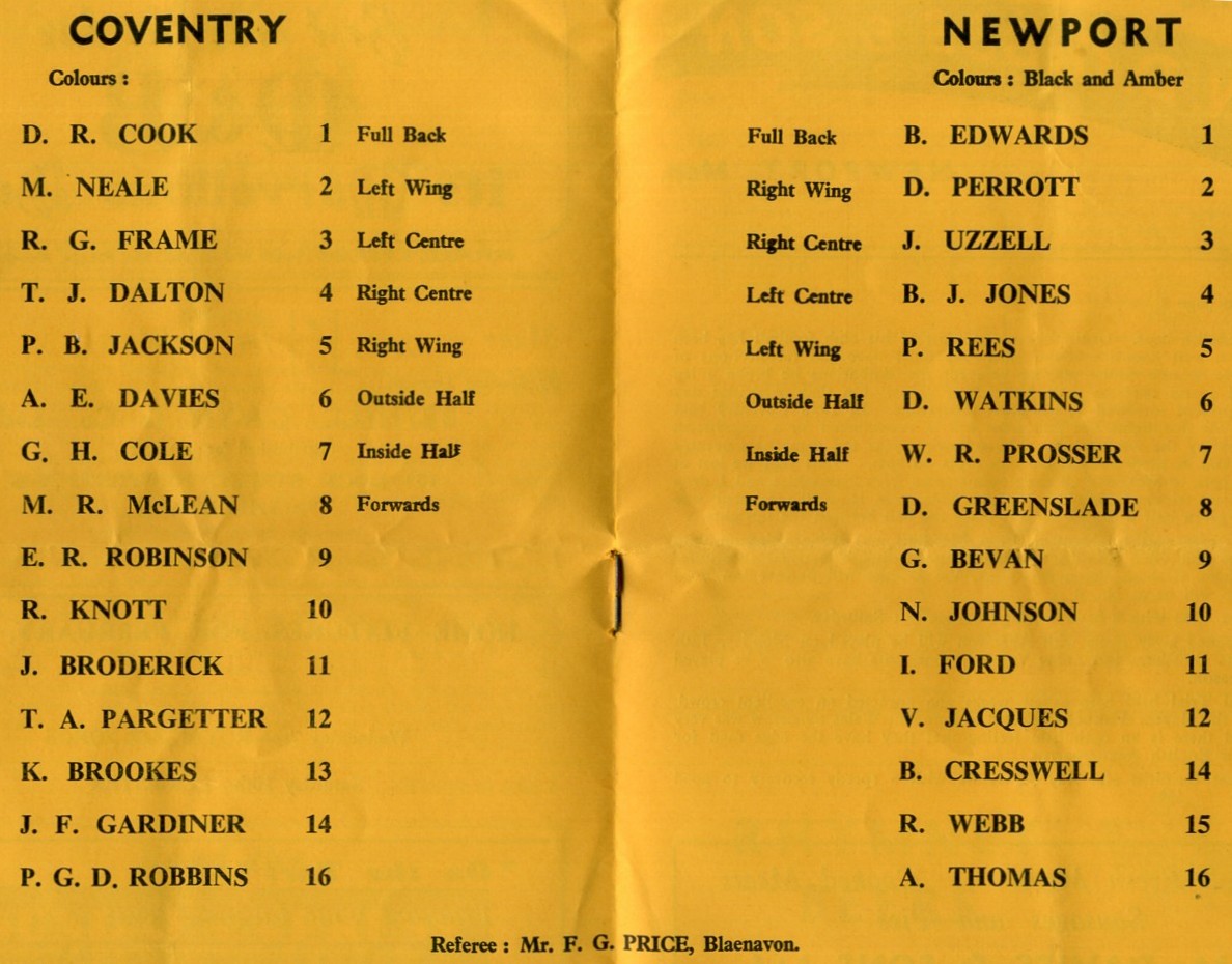 "Coventry bring a strong XV down to meet us. Their one representative playing at Twickenham is Phil Judd, prop forward (1st cap), and their English international hooker, Bert Godwin is a travelling reserve. Fortunately they can call on Ernie Robinson a former English cap to do the hooking. Peter Jackson, who has appeared 16 times for England is on the right wing. He is a very dangerous attacking player and he delights in breaking into the field, dodging and swerving, but always with one objective - his opponents goal-line. P. G. D. Robbins is another famous name in present day English rugby. His particular gifts as a wing forward makes him a thorn in the side of the opposition, and his keen sense of positional play helps him not only to initiate attacks but very often to be on the right spot at the right time to put finis to a successful movement. He first came into prominence with Oxford University (1954-57) and to-date has collected 18 English caps. Until this season most of his club football has been with Moseley a well known midland side. He must have sad recollections of Rodney Parade, because whilst playing here for the Barbarians he broke a leg and so missed a trip overseas with the British Lions. On that particular day every person present sorrowed at his great misfortune. In 1958 Coventry beat us here under the floodlights and this game will be remembered for a magnificent forward display by the Midlanders. The following year the game at Coventry was cancelled and in 1960 we won here by 11pts. to 8pts. Last year we lost at Coventry by 12pts. to 8pts. and all their points came from 3 penalties and 1 drop goal by their ace kicker, inside-half George Cole. He is in the selected side tonight and if given half a chance he will place the ball between the uprights."