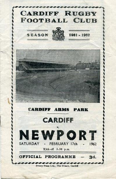 "Once again the battle is joined with our greatest rivals, for there is no denying the fact that both sides go on the field determined to demolish the opposition. An unusual situation has arisen in that both Cardiff and Newport have recently defeated Aberavon within four days of each, other, and both by ,the margin of penalty goals rather than tries. Thus one of the features of this game will be the comparative form of both the full-backs, Alan Priday and Norman Morgan; no doubt the Welsh selectors will view this duel with great interest. At half-back there will be a renewal of competition between the two young outside-halves Geoff Davies and David Watkins."