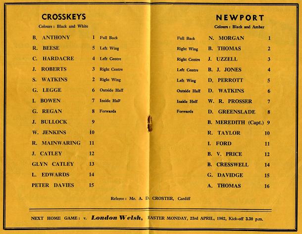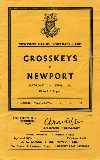 "Our visitors from Pandy Park are having a successful season. Their last appearance here was in January, 1961, when both sides failed to score. Unfortunately our away game with them in January this year had to be called off, due to weather conditions, although we did journey up the Western Valley to play them in a friendly on February 21st, when we shared six points. Crosskeys have been on a West Country tour this week. Their Club Captain is forward Peter Davies who has given years of yeoman service and it is rumoured that he is seriously thinking of throwing his boots into the River Ebbw at the close of the season. It is hoped that he will have a change of mind. Ian Bowen the inside-half is in the first flight of scrum workers, but he is also contemplating retiring from first class football. Garry Legge is still the complete footballer, being equally at home as a stand-off half, centre-threequarter or full-back. Three-quarter, Stuart Watkins made a strong challenge in the Welsh Trials and much more will be heard of this free scoring wing in the future. We hinted at two possible retirements but there is one taking the field today for the last time., and he is not of Crosskeys or Newport, but Cardiff! We refer to the popular referee Mr. A. D. Croster, who has so ably controlled many of our games. Referees are much maligned individuals but where would we be without them? Thank-you Mr. Croster, and we wish you a happy retirement from the whistle, although we know you will still be grafting as hard as ever administratively. You are now at liberty to sit in the stand and hurl friendly invective at the man in the middle."