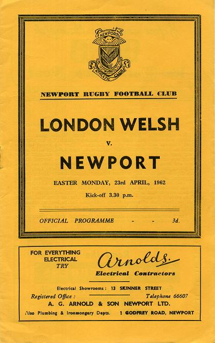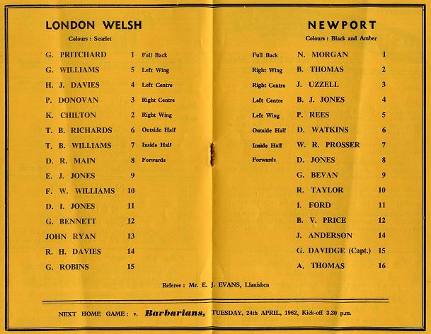 "We welcome the "Exiles" for our usual Easter Monday game. They undertake a strenuous programme over this holiday weekend. On Saturday they played Aberavon and tomorrow play at Pontypool. They run several teams in London so when they undertake this tour they have no difficulty in bringing a strong party down with them. Todate they have had a fairly successful season having won two-thirds of their games. In the party are two Newport fellows, Lucas and Ryan. The latter made twenty appearances for Newport last season and played this season for us against Bridgend. Forward, Gwyn Lewis is the Club Captain and he is also a former Newport player. Another Newport player who turned out regularly for them earlier in the season was Leighton Jenkins who later concentrated on Services football. Brian Richards (Swansea and Wales), has been in mercurial form at outside-half. Robin Davies the Welsh blindside wing-forward is included in the Barbarians party although he probably will be available if required. Prosser-Harries, a light blue and formerly of Swansea is in the front rank of present Welsh full-backs. In the last two encounters 53pts. have been scored which speaks for itself on the type of rugger played."