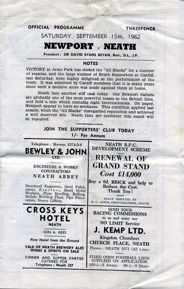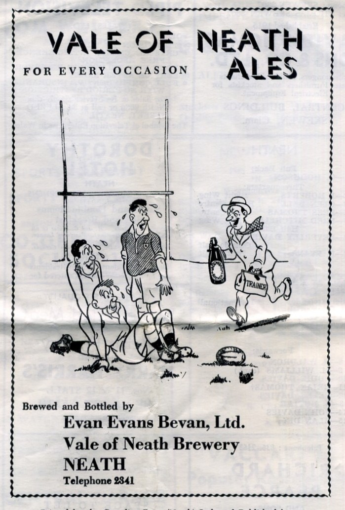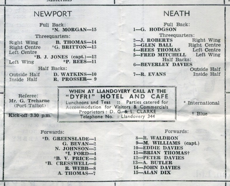 "Neath face another stiff task today. Our Newport visitors are probably one of the most powerful teams in the British Isles, and field a side which contains eight Internationals. On paper Newport appear to have no weakness. This condition applied last season, when the "All Blacks" disregarded reputation and achieved a well deserved win. Neath fans are confident this result will be repeated."