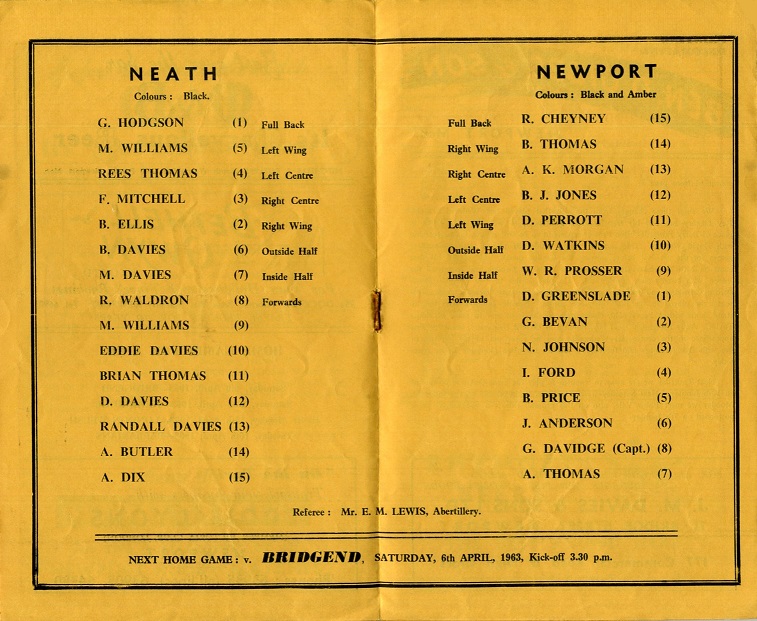 "We show three changes from the side that played last Wednesday night. Ray Cheney has had his transfer from Pontypool, so will be at full-back in place of Barry Edwards. Bob Prosser reports fit so he will resume his partnership with David Watkins. This popular young inside-half played sixty consecutive games for the 1st XV before missing the Cardiff match. He played his first game on 25th November, 1961, against the Exiles in London and completed the season with twenty-nine appearances. He played also in two friendly games against Crosskeys and Bridgend and was in the victorious “Sevens” side. This season he played in the first thirty-one games. Neville Johnson, who had to stand down with a heavy cold, comes back to the front row in place of Roger Taylor. Andy Morgan, a local boy, now up at Oxford University, made his first appearance in the centre last Wednesday and he came out of his baptism of fire with flying colours and thoroughly justifies his place alongside Brian Jones today."