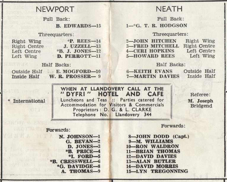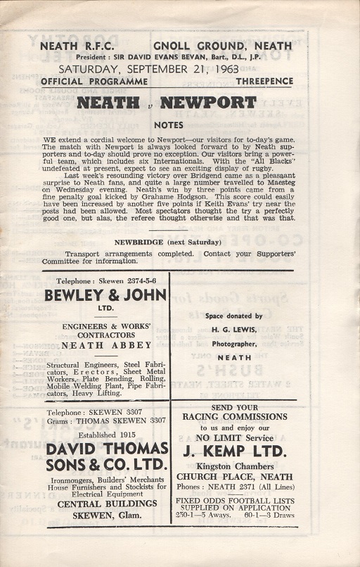 "Last week’s resounding victory over Bridgend came as a pleasant surprise to Neath fans, and quite a large number travelled to Maesteg on Wednesday evening. Neath’s win by three points came from a fine penalty goal kicked by Grahame Hodgson. This score could easily have been increased by another five points if Keith Evans’ try near the posts had been allowed. Most spectators thought the try a perfectly good one, but alas, the referee thought otherwise and that was that."