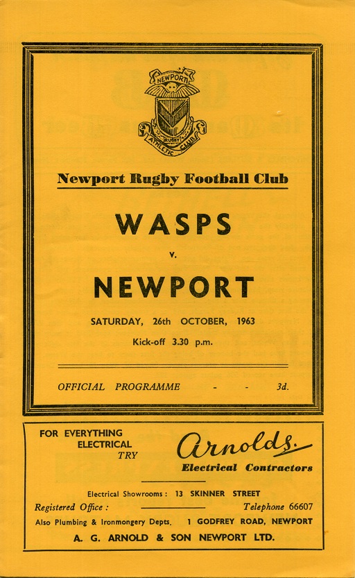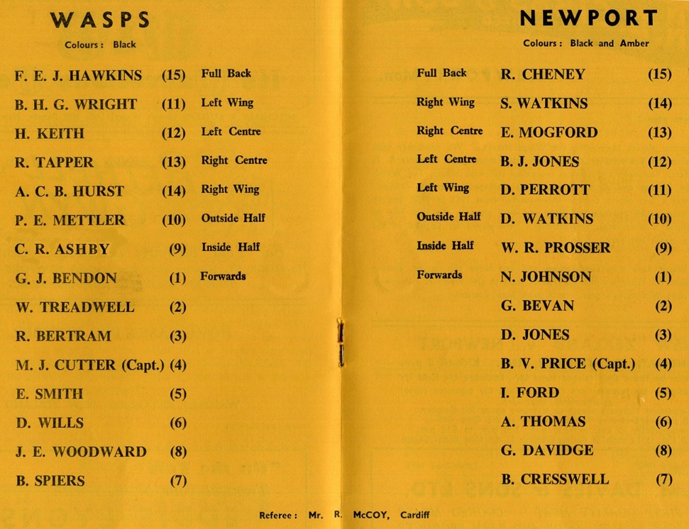 "Although the Wasps are not one of London’s "fashionable" rugby clubs, they are probably the most efficiently run, and their efforts with regard to the promotion of the game among youngsters is quite unrivalled by any other London Club. And they are one of Newport’s most popular opponents. Although they first met 35 years ago, Wasps did not win a permanent place on Newport’s fixture list until after the last war. Now they are permanent opponents, and everyone now knows that a special trophy is at stake at each match. This is a special miniature wasp, handsomely mounted, which Wasps had specially made in 1950, following a dispute over a flag. This all came about when, in 1949, Wasps won for the first time at Rodney Parade, and, as a trophy, confiscated a new Newport flag. Newport duly won the flag back in the following season, and then Wasps had their miniature trophy made. Since then Newport have held it many more times than Wasps, and they do so now. Three times in the last eight years Newport have had the honour of being the first team to beat the Wasps. The record for all the games at present stands: Played 37, Won 30, Lost 6, Drawn 1. Newport have scored 506 points against 182."