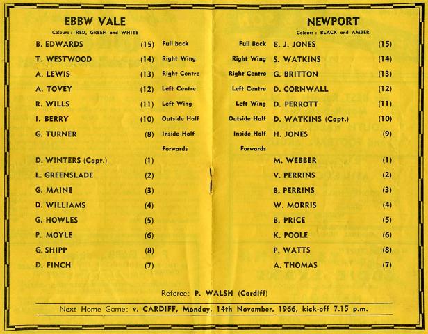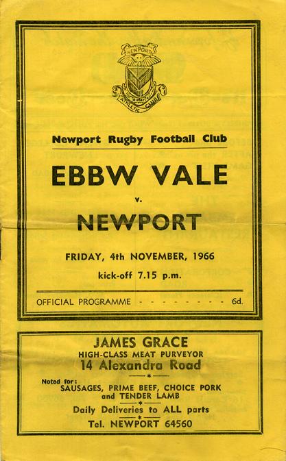 "Today, of course, Ebbw Vale pay their second visit to Rodney Parade this season. In Newport's opening match the valley club were beaten 8-3, but since then they have beaten, among other clubs, Abertillery, Cross Keys (twice), Bridgend (25-14 on the current champions' own ground) and Gloucester."