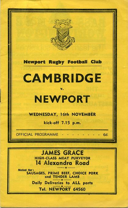 "Off and on, Cambridge University have been on Newport's fixture list since 1888, but there have been many gaps. One of the most extra?ordinary matches of recent years was that in 1952. There was no score in the first half, but Newport eventually won by 3g (1p.g.) 4t. 25pts. to nil."