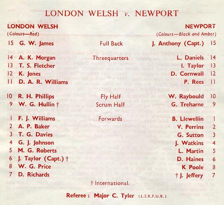 "Earlier we said that three former London Welshmen play today for Newport. Now we must add that three former Newport players turn out for London Welsh. Bob Phillips, Freddie Williams and Trevor Davies face up to their former colleagues, and we suppose that the final reckoning will be made in the bar at a somewhat late hour."